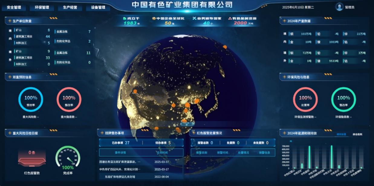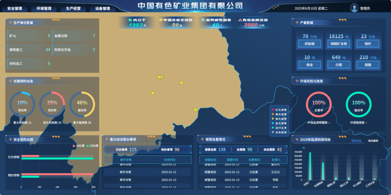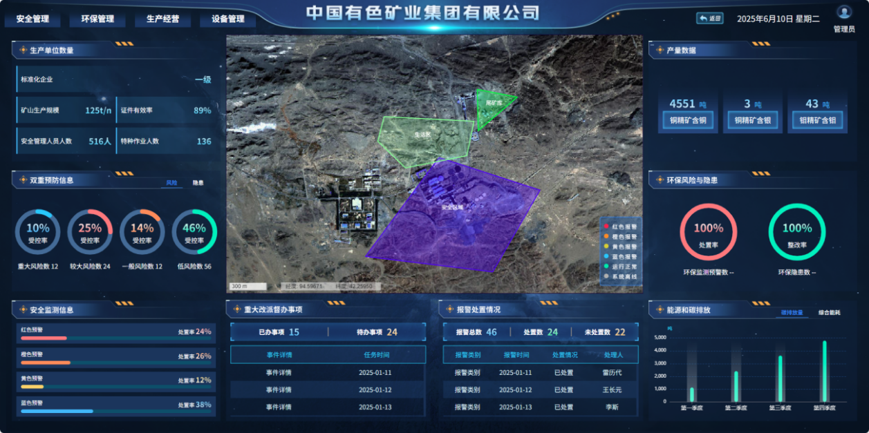 主要性能指标:支持40家以上生产单位数据接入,实现对重大风险、较大风险的实时监测,管理效率提升超30%,决策响应速度提速超50%,可自动核算企业碳排放量并进行智能预警。适用条件范围:适用于有色金属矿山、金属冶炼等工况,可满足地下矿山、尾矿库、冶炼厂等不同类型矿山企业的安全环保碳排放管理需求,助力企业实现“生安环”一体化管控。